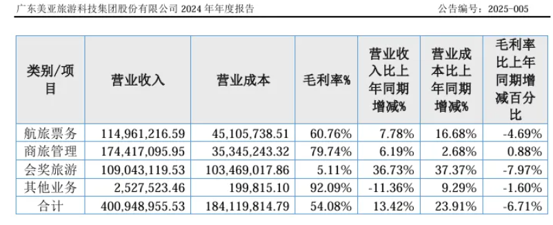 到了2024年,三大业务的营收占比分别为28.85%、43.78%、27.37%,延续了2023年的发展态势,对应贡献的毛利率分别60.76%、79.14%、5.11%,同样是商务管理业务最高。至此,美亚科技的航旅票务、商旅管理、会奖旅游实现协同发展,并确认了商务管理的核心地位。