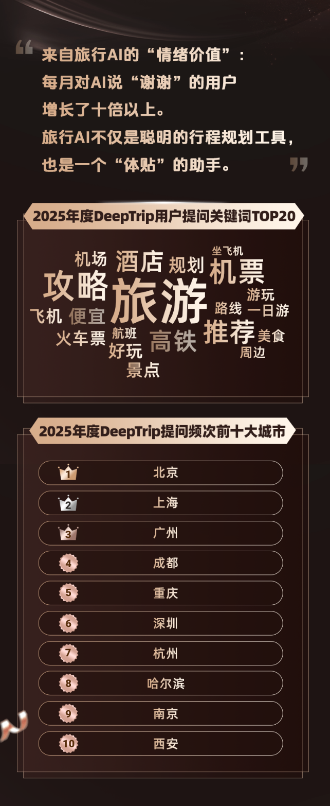 根据同程旅行DeepTrip2025年3月至12月的数据,用户与DeepTrip的对话关键词主要集中于旅游行程规划及交通、住宿等产品的预订咨询。在对话当中,北京、上海、广州、成都、重庆、深圳、杭州等中心城市和热门旅游目的地被提及的次数相对较高。值得关注的是,随着AI交互体验的快速迭代,用户越来越倾向于将AI视作自己的旅途伙伴而不仅仅是一个工具。数据显示,在最近九个月时间里,主动向AI发送“谢谢”的用户数量增长了十余倍。旅行智能体的“类人化”不仅解决了用户的具体出行问题,而且在交互过程中也为用户提供了“情绪价值”。