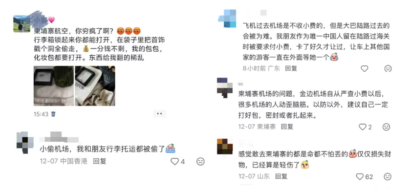 有人说陆路过关被索要小费,有人吐槽在金边机场托运行李被翻、被偷,还有人直言“感觉敢去柬埔寨的都是命都不怕丢的”。