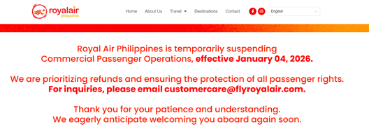菲律宾皇家航空(下称“菲皇航空”)宣布,2026年1月4日起,停飞商业客运航班。