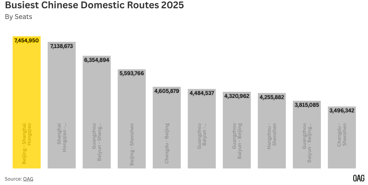 北京首都-上海虹桥,以750万个座位位列第九;