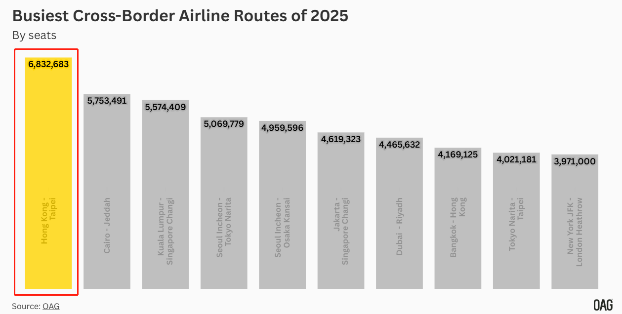 2025年全球最繁忙跨境航线,依然由亚洲航线主导,前十榜单中亚太地区占据七席。