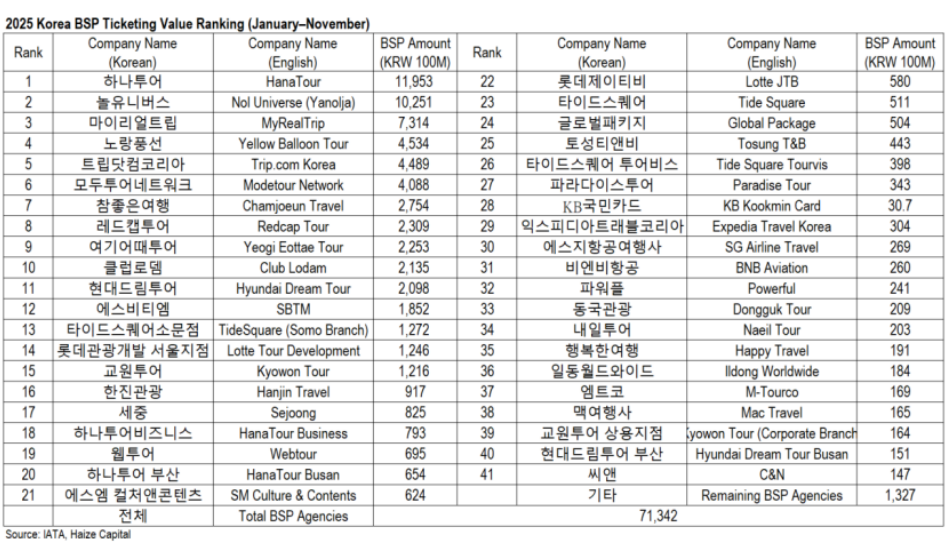 自2025年10月起,HanaTour首度让出BSP出票总金额冠军位置,降至第二名,直到11月仍未能重回榜首,且与第一名的落差快速增加。做为取而代之的新晋第一名,则是以OTA为核心逻辑成长起来的Nol Universe(Yanolja)。