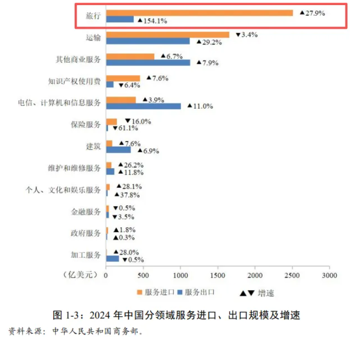根据商务部的数据,2024年中国旅行服务逆差超过1.5万亿元,是中国服务贸易领域最大的逆差项。