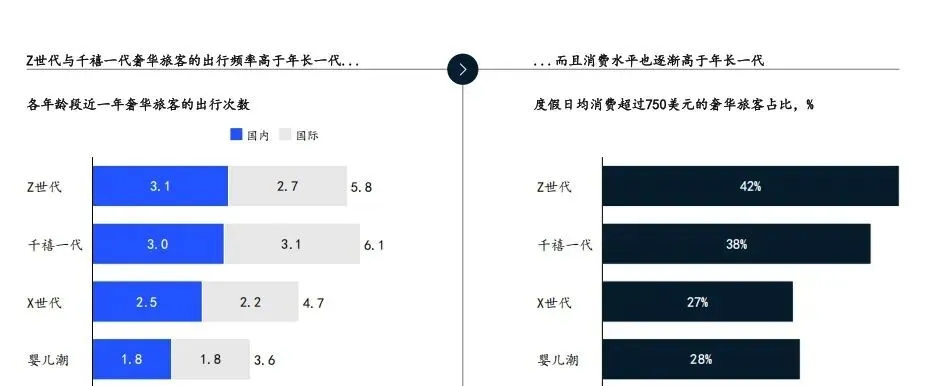 无论是奢华旅游的年均出行次数,还是高端旅游消费的比例,年轻旅行者(Z世代与千禧一代)都明显高于X世代和婴儿潮一代;在日均消费超过750美元的旅行者中,Z世代的占比位居所有代际之首。