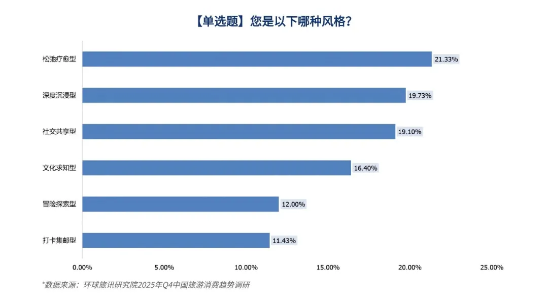 环球旅讯研究院在2025-Q4的中国旅游消费趋势调研中也进一步量化了这一转变,仅11.43%的受访者仍偏好传统打卡式旅游,主流需求已分化为两大阵营: