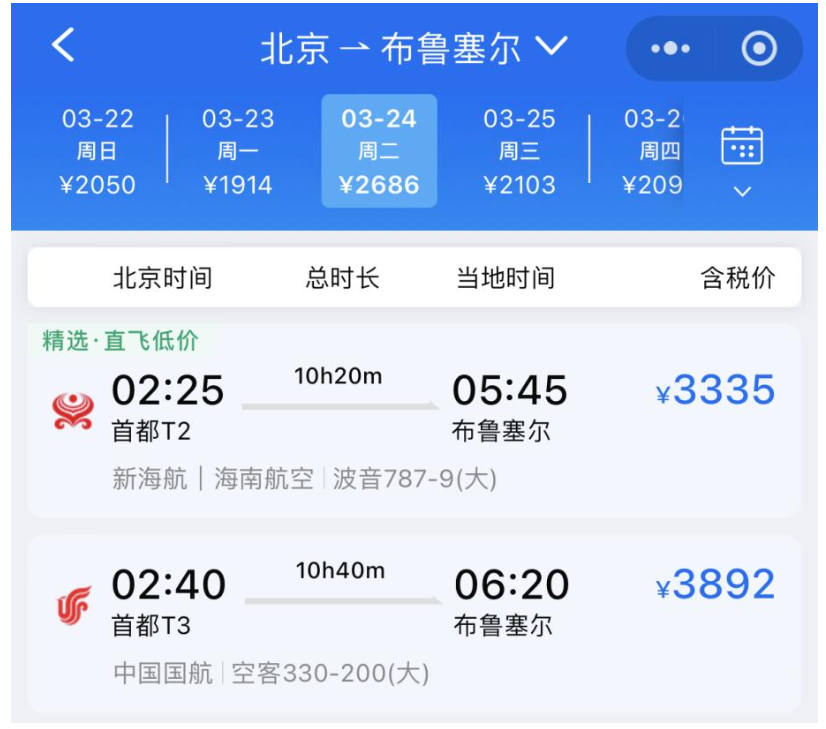 从OTA平台来看,以3月24日为例,北京—布鲁塞尔单程,海航含税价低至3335元起,明显比国航的机票价格低。