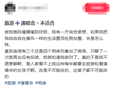 为了劝退相亲对象,机智的网友把自己旅游、看演唱会追星的精致照片,置顶在了朋友圈。
