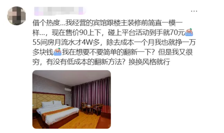 就像这位宾馆老板吐槽的一样:“我55间房月流水才4W多,除去成本一个月就挣一万多块钱,我在想要不要简单翻新一下?但是我又很穷,有没有低成本的翻新方法,换换风格就行。”