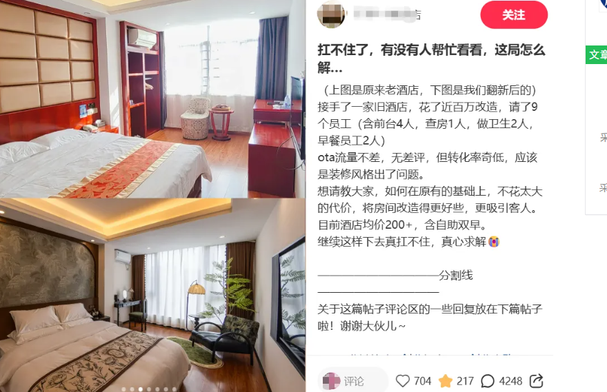 在笔者看来,这则求助贴,恰是存量酒店市场的一个缩影。无数存量酒店老板和这位博主一样,砸了钱改造却抓不住核心需求,陷入“投入高、转化低、运营难”的僵局。