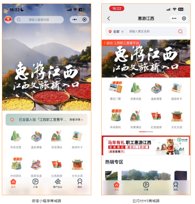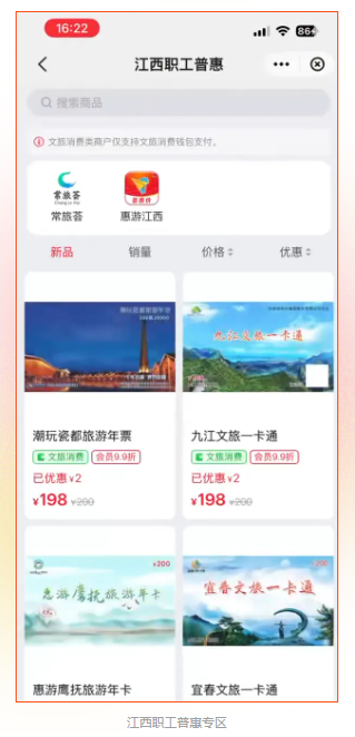 针对全省500多万工会会员,通过H5商城接入江西职工普惠平台。工会会员登录云闪付APP进入“职工普惠”专区,完成个人信息认证后,即可进入“文旅消费”页面的「惠游江西」专区,享受专属普惠价购买景区产品。