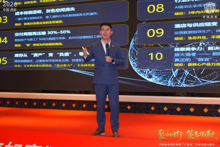 中小企业管理专家金勇则分享了酒店供应链管理的前瞻趋势。他指出,行业进入存量优化阶段,供应链企业需构建产品力,重点关注标准化、体验化、效率化。他特别展望了AI将加速的十大管理趋势——包括经验替代、成本透明、交付周期压缩等。金勇强调,供应链企业必须以产品力提升自身生命力,从而助力客户整体产品力的持续增强。