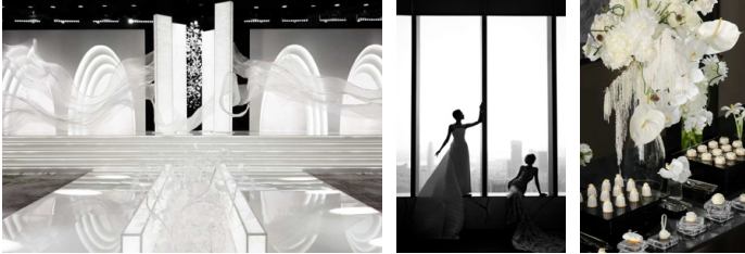 伴随乐章曼妙递进,模特身着定制婚纱款款步入舞台,一场由光影、材质与空间语境共同构成的婚礼美学演绎,仿佛由空灵梦境步入现实之中。莹白光幕与婚纱轮廓交织起伏,蕾丝刺绣的精致纹理、极简廓形的现代线条与层叠裙摆所延展出的轻盈张力,动静之间彰显非凡格调与隽永意境。