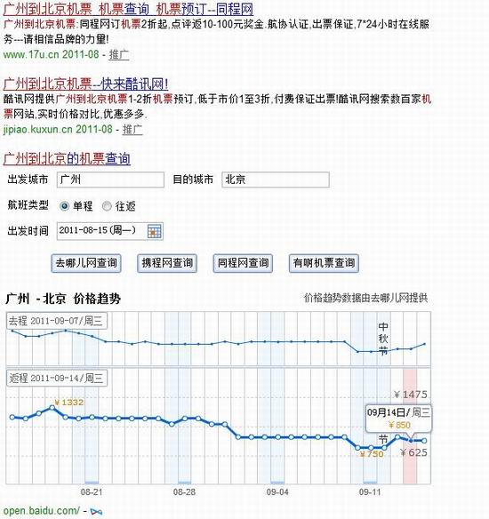 在百度搜索框内,当输入“某地到某地机票”,在搜索结果页面顶端显示的是携程网、同程网、酷讯网的赞助商链接,再往下显示的就是包括出发城市、到达城市、出发时间、航班类型等选项的搜索框,搜索框下面则是去哪儿、携程、同程网和百度旗下的有啊机票查询的链接。而引人注目的是,在这个搜索框下方显示的是一个机票价格趋势表(如下图),表格右上方显示“价格趋势数据由去哪儿网提供”字样。该图表显示了从搜索当天之日起的一个月以内,去程和返程的两条价格趋势变化趋势,两条曲线上的节点分别代表每一天去程和返程的机票价格,点击其中的任何一个节点都可以链接到去哪儿的相应日期的航班搜索结果页面。