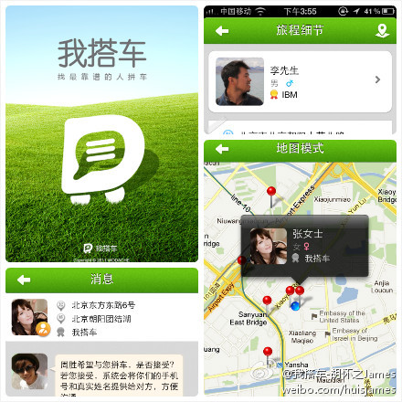 胡怀之:如上文所言,“我搭车”是中国第一个针对社交的拼车平台,目前已经测试上线的有可兼容主流浏览器的网页版和iPhone客户端。