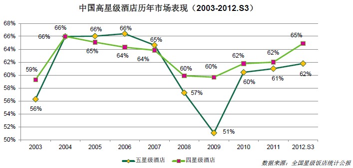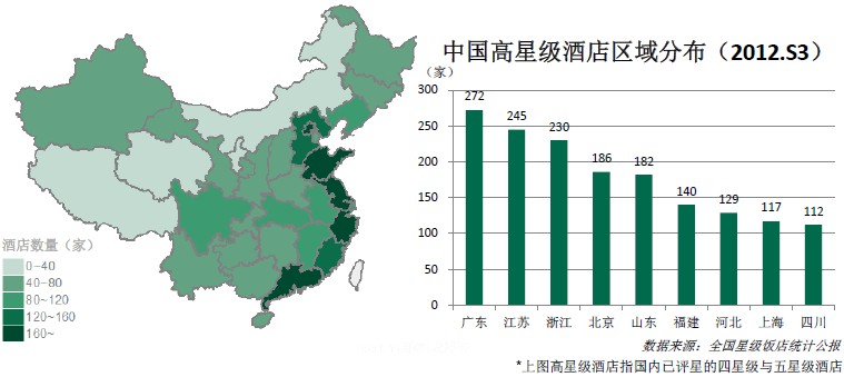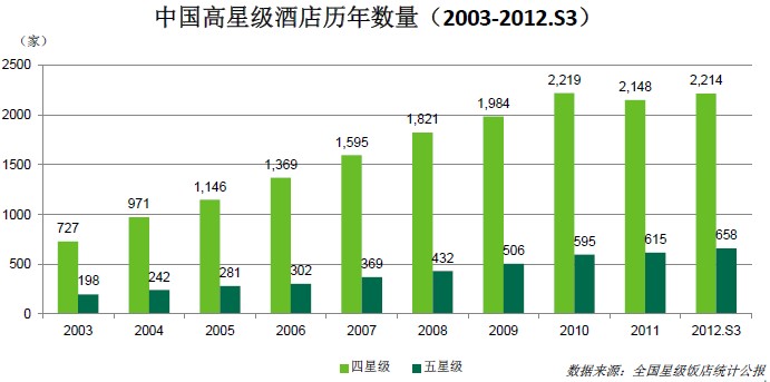 中国四星级酒店和五星级酒店的数量在近几年逐渐增长,截止2012年第三季度,中国共有五星级酒店658家,四星级酒店2214家。由于一批本土和国际高端酒店集团在国内大、中、小型城市的急速扩张,四星级酒店和五星级酒店的数量也大幅增加。