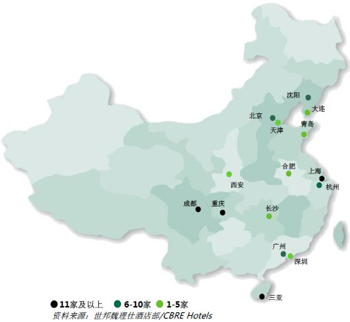 如图所示,在未来三年里,高星级酒店项目保持了从沿海一线城市向二、三线城市拓展的趋势,将在成都、重庆、长沙等地开设多家高星级酒店。