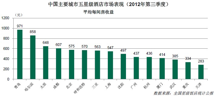 如图所示,北京、上海和广州作为中国传统的一线城市,酒店行业较为成熟,竞争比较激烈,五星级酒店的平均每间房收益位于中间水平。